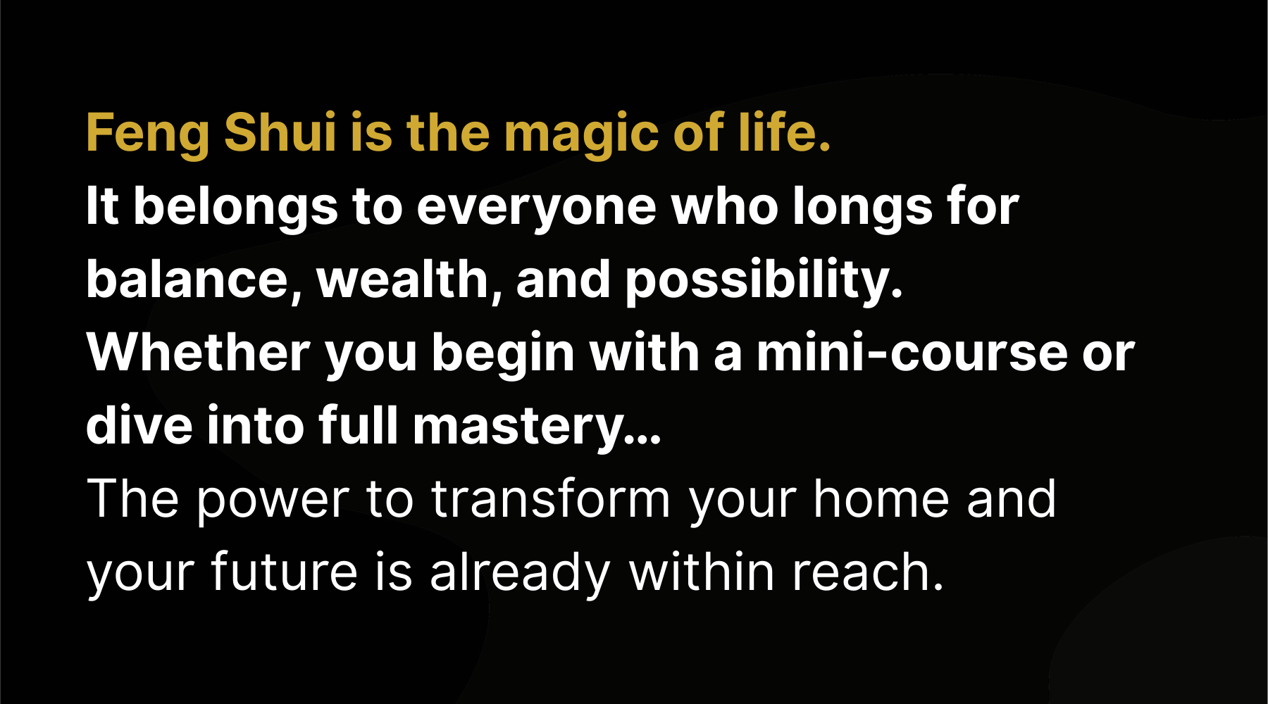 Whether you’re ready to dive deep with the Feng Shui Mastery Course, or you’d like to start small with focused mini courses, there’s an option designed to meet you exactly where you are.